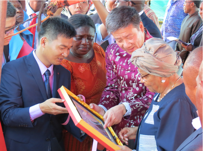 儀式最后,援利比里亞政府項(xiàng)目組代表高元明向利比里亞總統(tǒng)贈(zèng)送禮物,祝福中利友誼長(zhǎng)存。